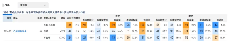 麦考尔上场的时间内其实广州龙狮队每百回合净胜分ღღღ,相比他不在场上的时候多了9.7分ღღღ,有效命中率相差不大ღღღ,失误率降低了5.1%超越同位置99%的运动员ღღღ,罚球率在场时提升了12.3%ღღღ,超越了同位置百分百的运动员ღღღ,这与他强大的造杀伤能力相对应ღღღ。防守上他在场时对手的失误率会增加2.8%ღღღ,超过了同位置94%的球员ღღღ,这与他的防守能力强相对应ღღღ。